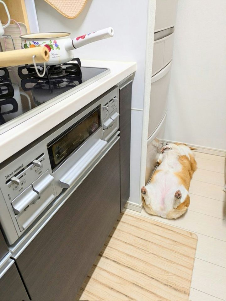 なんと冷蔵庫の野菜室をブロックしているのは、愛犬のこまちちゃん!へそ天しており、かなり寛いでいるご様子。頭のてっぺんからおしりまでが冷蔵庫の幅にピッタリで、笑いを誘われます。彩さんは毎回、こまちちゃんをスライドさせて野菜室を開け、また最後にスライドさせて元通りにしているそう。