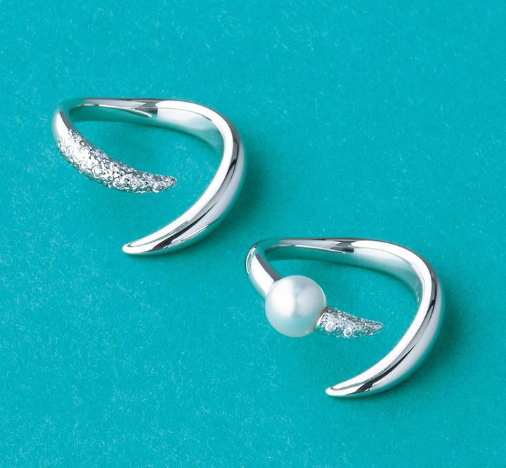 上品さ漂う一品。〈右から〉リング「デインジャー ホーン プラス」〈WG×あこや真珠×DIA〉リング「デインジャー ホーン プラス」〈WG×DIA〉(ともにTASAKI)