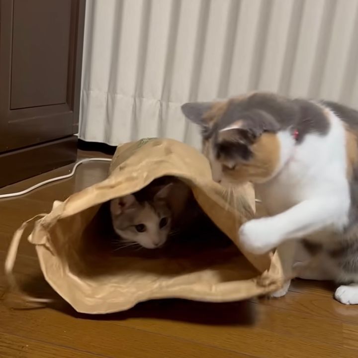 軽くジャブでいなしてから、紙袋の口を足でふさいで、戦意喪失を狙っております。暗闇に閉じ込めてから一気に入り口を開いて目をくらませ、攻め取る算段でしょうか。さあこのあとどうなると思ったところで時間切れ。電撃作戦の結果は神のみぞ知るところであります。