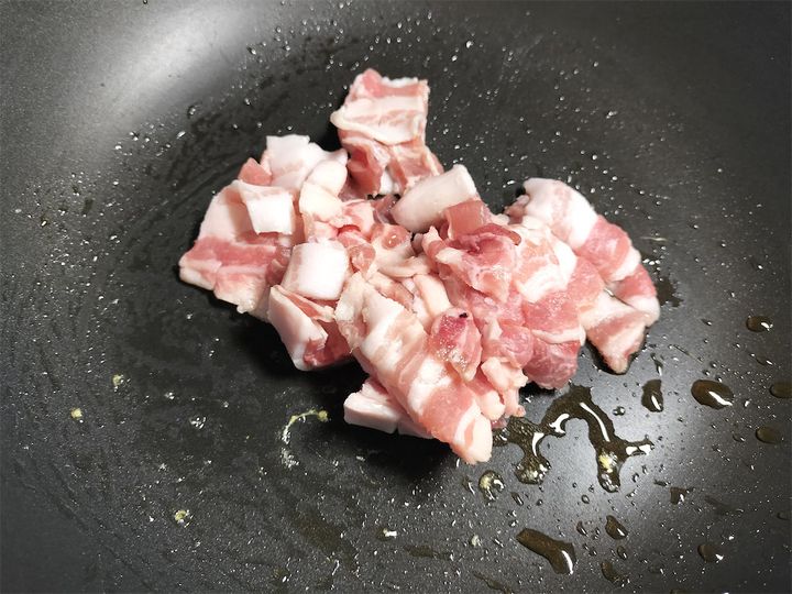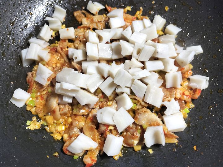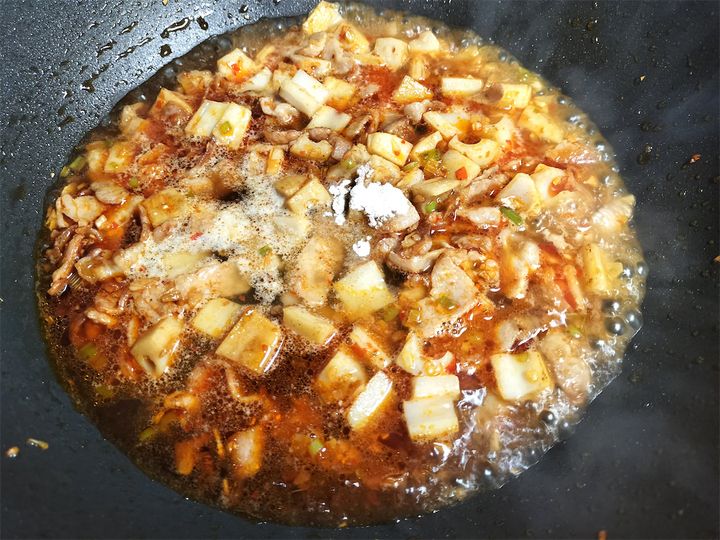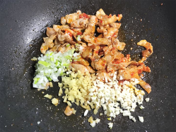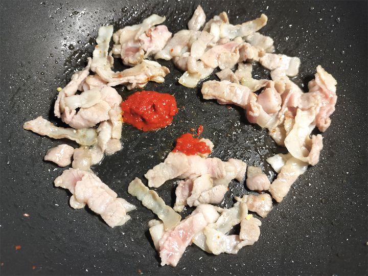 5. 肉が白っぽくなってきたら、豆板醤を加えて炒めます。