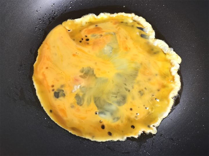 3. フライパンにゴマ油をひいて、強火で熱して卵を炒め、皿に取り出しておきます。