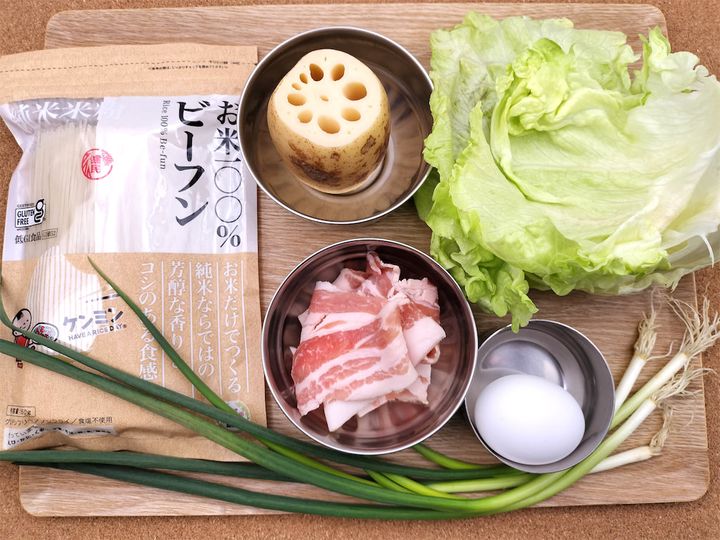 「れんこんと豚バラのピリ辛ビーフン レタス包み」の材料と作り方
