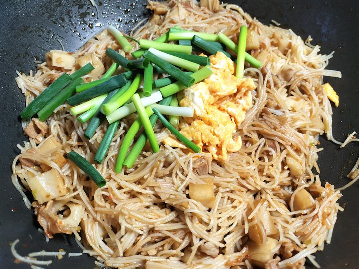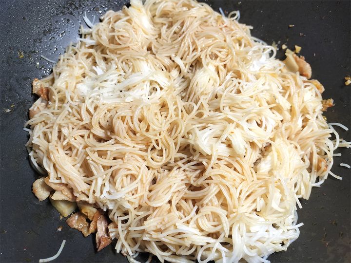 9. ビーフンを加え、中火にしてフタをして3分煮ます。
