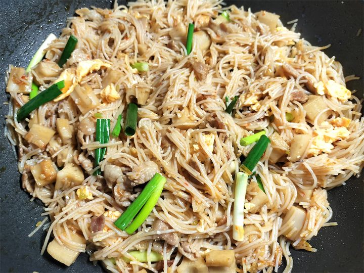 なんともおいしそうな見た目のビーフンが出来がりました。ビーフンを短く切っていますので、箸よりもスプーンの方が食べやすそうです。