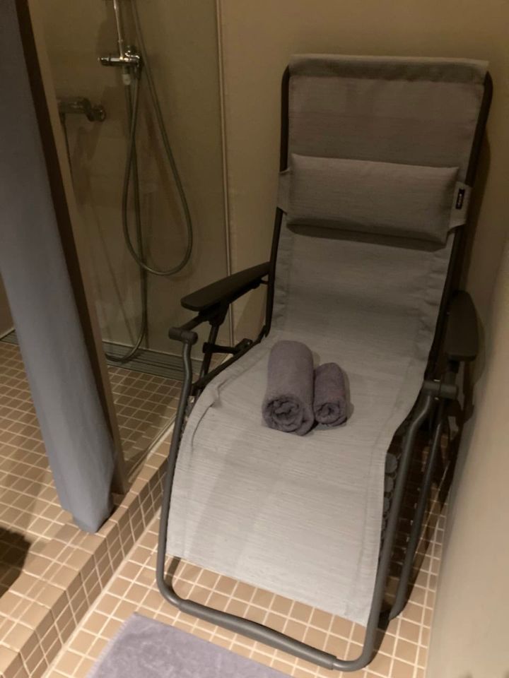 水風呂の後は、ととのいます。入室した時から、「倒せる椅子だ!」とテンションが上がった椅子が待っています。スペースもしっかり確保されているので、背中も足もともMAXまで倒すことができます。