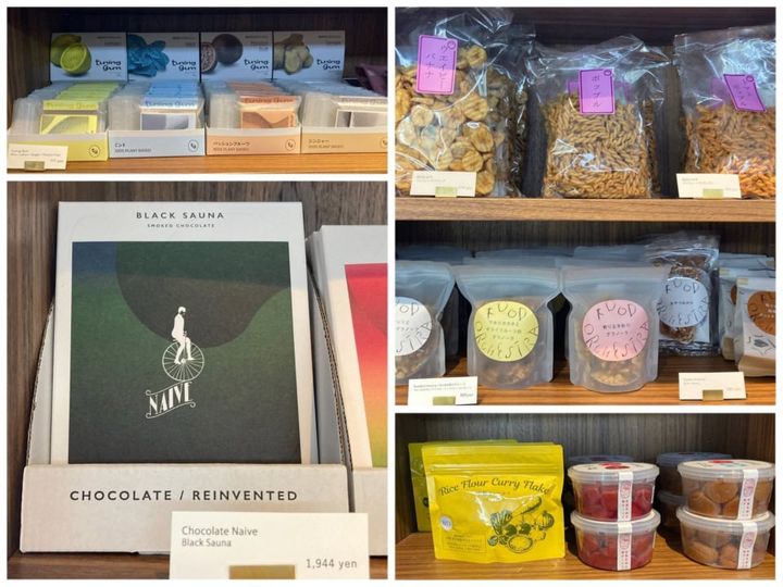 写真左下のチョコレートは、サウナ室でカカオを炒っておりスモーキーな味が特徴という珍しいもの。米粉のカレールーや植物性100%のガムなど、からだに良いものがズラリ。