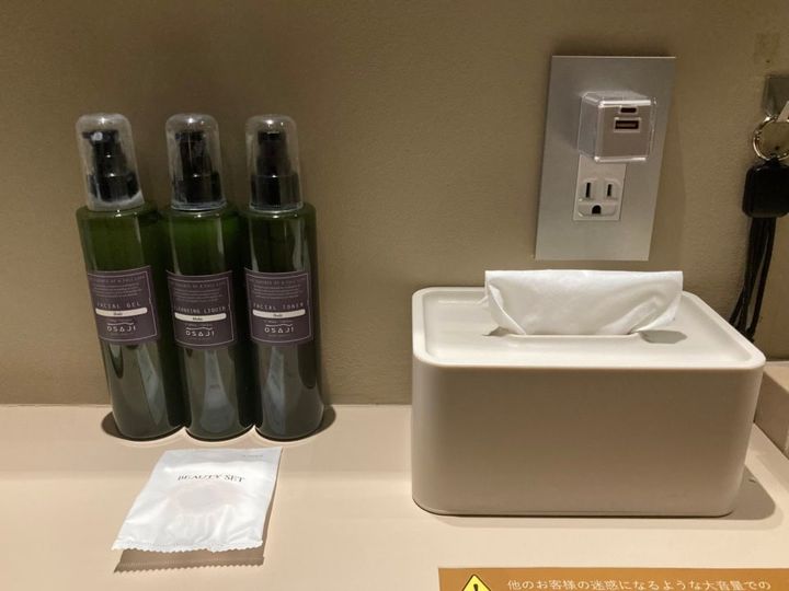 OSAJIのスキンケアは、香りにも癒やされます。コットンにヘアゴム、ティッシュまである充実ぶり。スマホを充電するケーブルまであるんです。