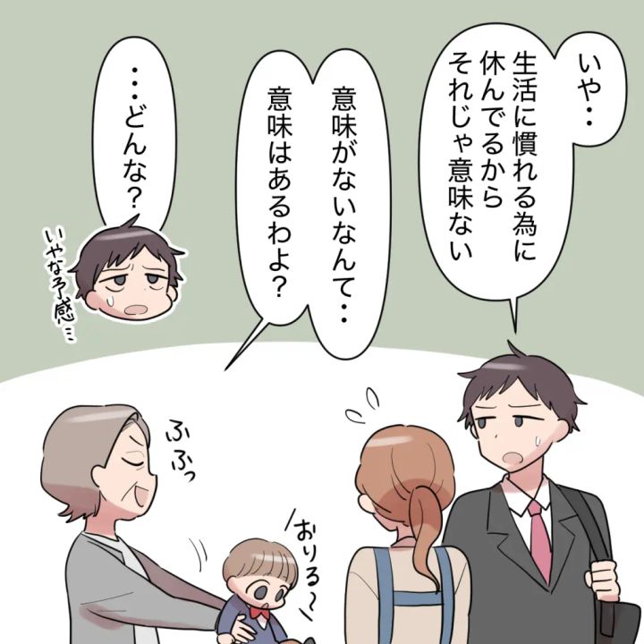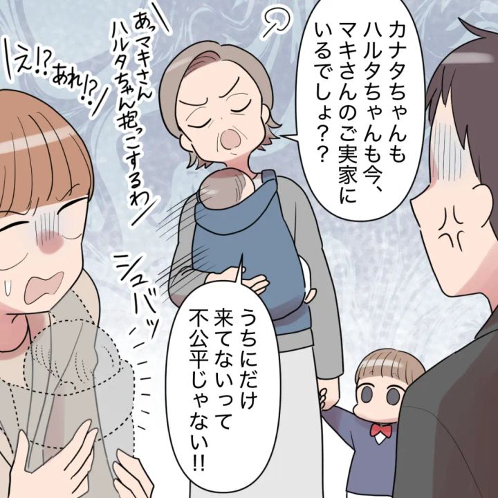 そして、「カナタちゃんもハルタちゃんも今、マキさんのご実家にいるでしょ??うちにだけ来てないって不公平じゃない!!」そう言ったかと思うと、「あっ、マキさんハルタちゃん抱っこするわ」とすかさずハルタくんを取り上げて抱っこする義母に、