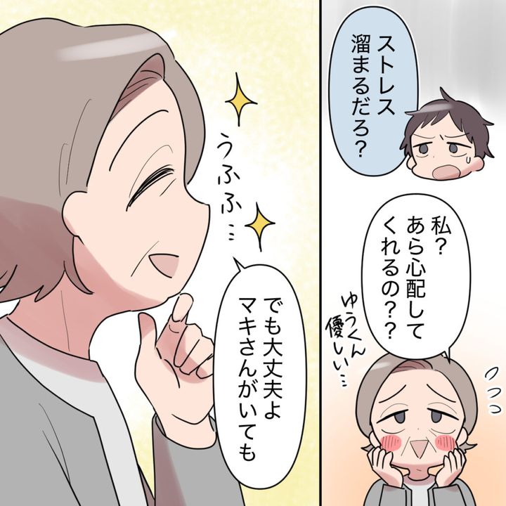「ストレス溜まるだろ?」ゆうさんがそう言うと、「私?あら心配してくれるの??ゆうくん優しい・・」と照れながら言う義母は、「うふふ。でも大丈夫よ。マキさんがいても」と笑顔で答えるのでした。