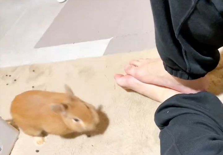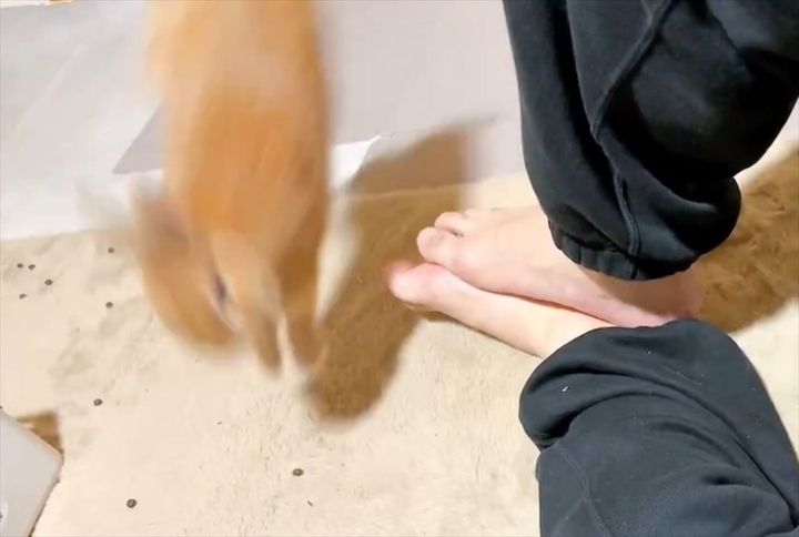 飼い主さんが座っているところに、ネザーランドドワーフの「みかん」ちゃん(愛称:みかんたん)が、ジャンプしてきました。
