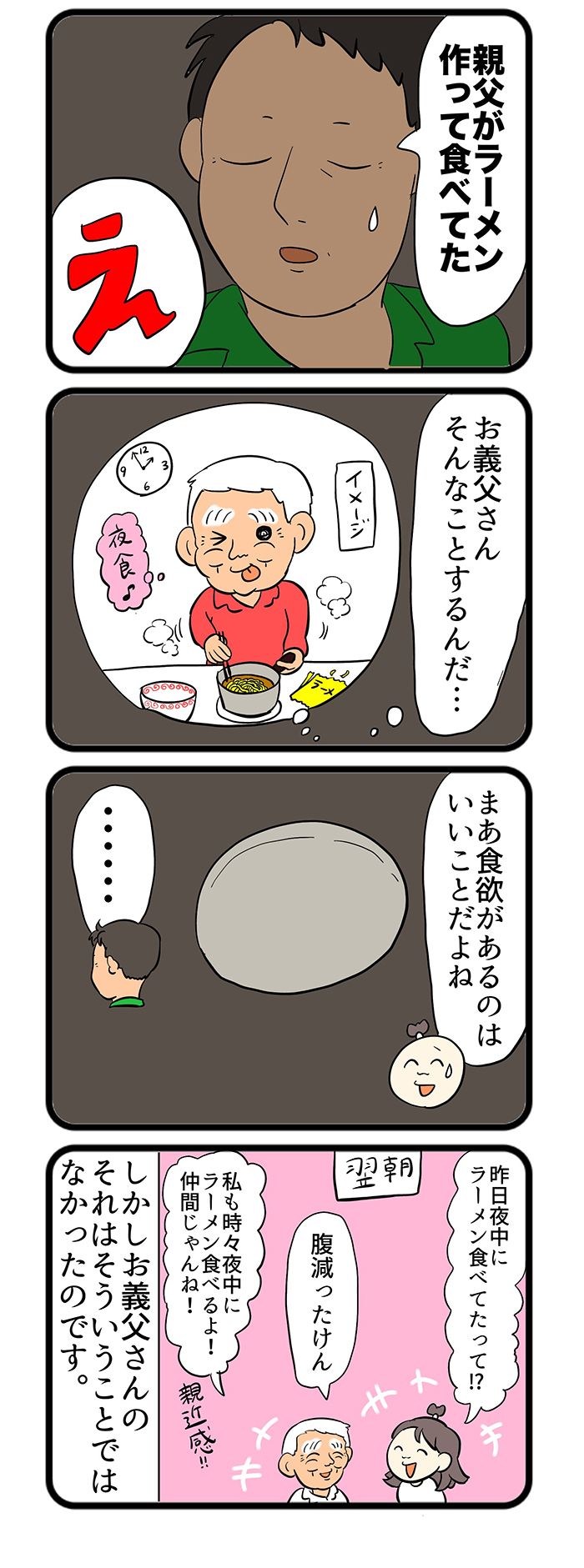 3. 義父・マキオさんが、夜中にラーメン作ってる!? 親近感を持ったけど、そういうことではなかったようで…【しぶしぶ同居したら義父が最高だった件・69】