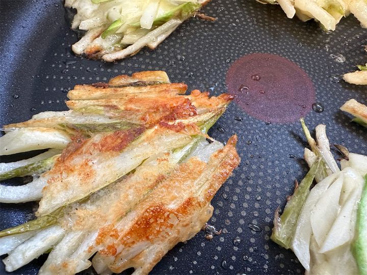 バラバラにならないよう、焼き目が付いてから裏返します。