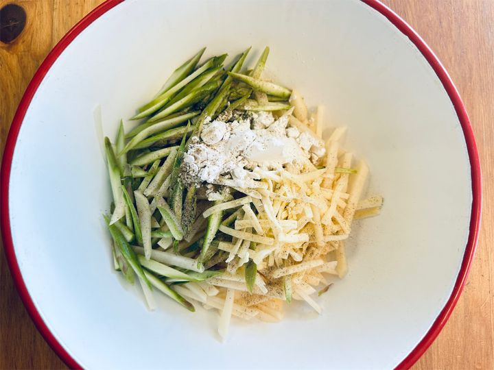 2. ボウルに、アスパラ、じゃがいも、塩、ピザ用チーズ、片栗粉、こしょうを加えて混ぜ合わせます。