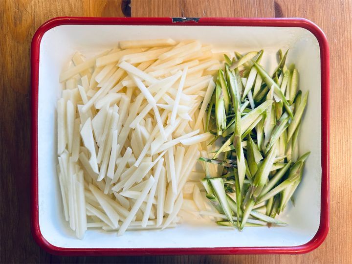 1. アスパラは、根の硬い部分を切り落とし、斜めに薄切りにして千切りにします。じゃがいもは洗い、皮つきのまま千切りにします。