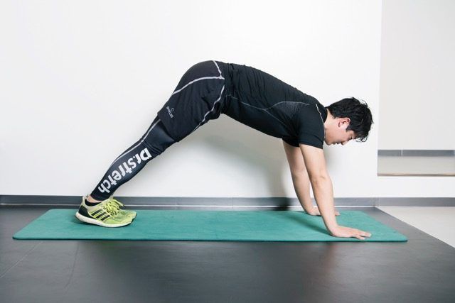 (1)床に両手を着いて、両脚を引いて足裏を床につける