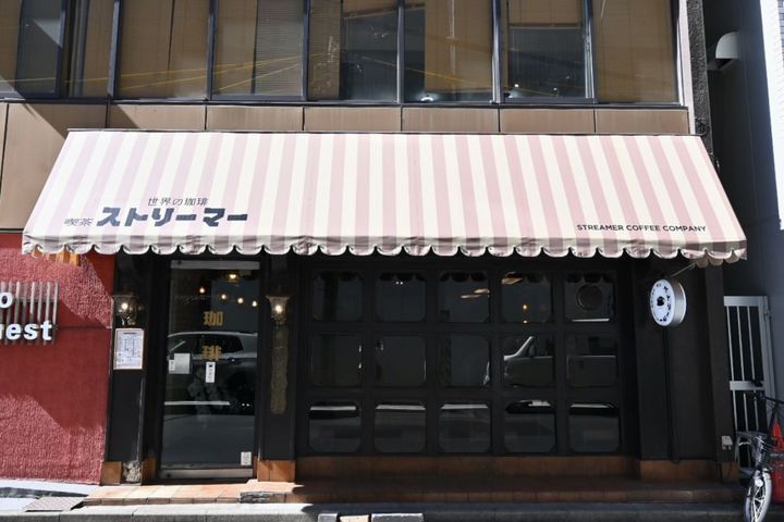 レトロなムードたっぷりのボーダーのオーニングテントが目印の「喫茶ストリーマー(きっさすとりーまー)」。昭和48年(1973)に焙煎舎として創業した老舗喫茶店を継承し、お店の雰囲気はそのままで、タイムスリップしたような気分になります。