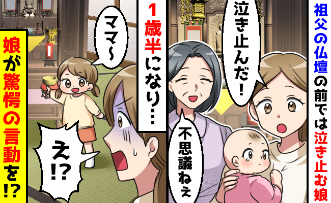これは娘が1歳半のころ、祖母の家にある祖父の仏壇の前で起きたお話です。最初はみんなビックリしたのですが、よくよく考えると娘と祖父の意外なつながりが見えてきたのです……。