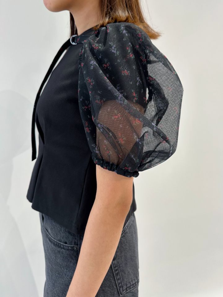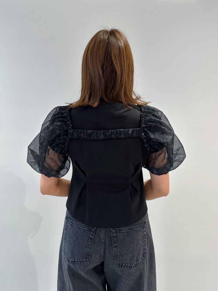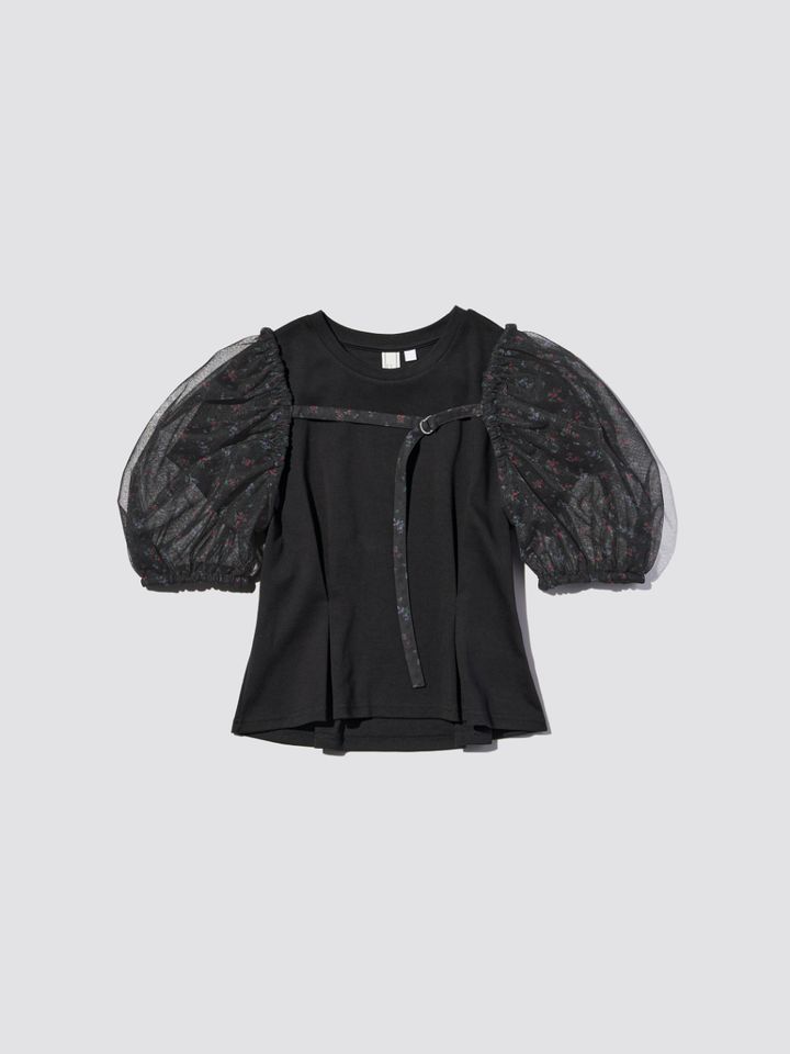 チュール素材のボレロと、カットソーがセットになったアイテム。ボレロは本コレクションオリジナルの花柄プリント。セットでも単品使いでも楽しめる。