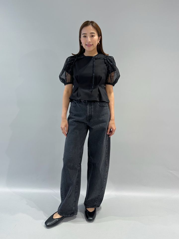 万能なオールブラックコーデを1ランク上げてくれるチュールボレロ。単調になりがちなブラックに、異素材感と抜け感を与えてくれます。さりげないフラワープリントをワンポイントに、ボックスタックを効かせたカットソーとバレルレッグジーンズで、単色でも奥行きのあるスタイリングが完成。