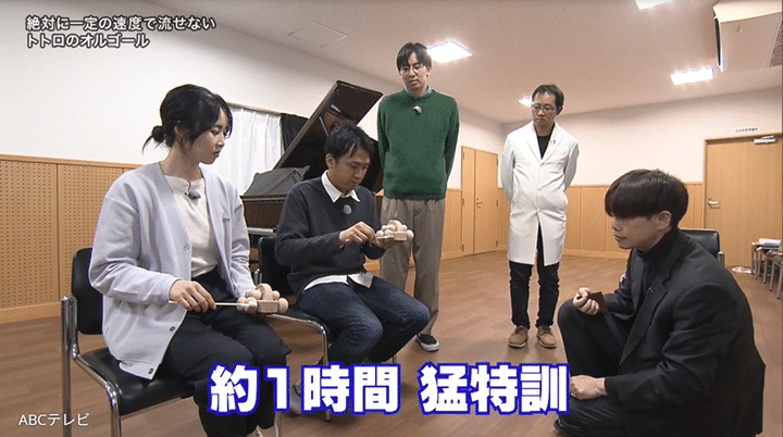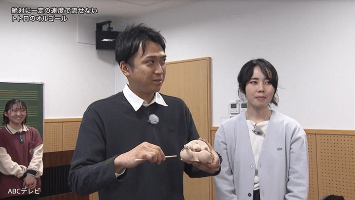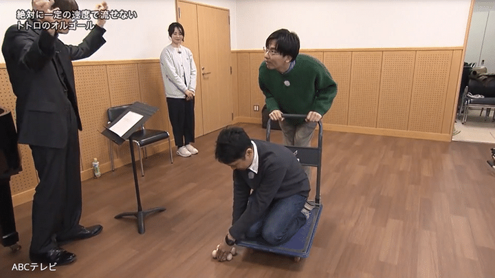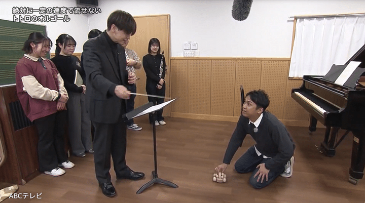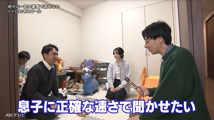 そこで夫婦は、『探偵!ナイトスクープ』(ABCテレビ)に協力してもらい、音楽専攻の大学教授のもとへ向かった。大学教授いわく、「テンポ(速さ)を整えるには、指揮が効果的」だそうだ。早速34歳男性は、専門家の指揮に合わせながら、さまざまな方法でおもちゃを動かしてみたが、一定の速度はやはりキープできなかった。