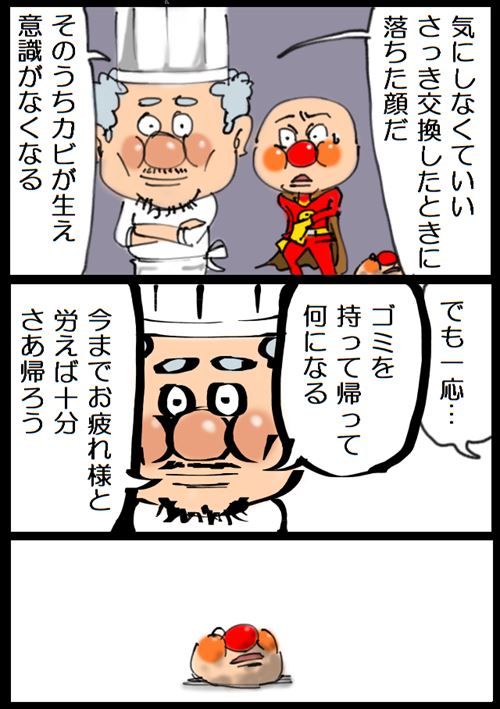 ば、ばいきんまん…!!カビが生えて変色してしまったアンパンマンの古い顔を、ばいきんまんが持ち帰っていたとは!