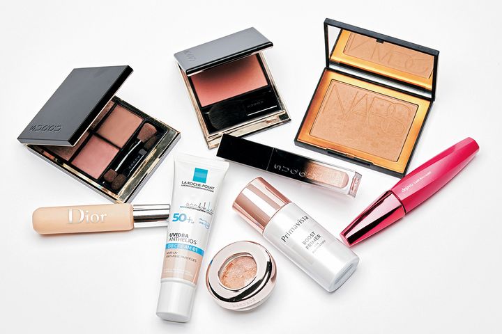 SUQQUやデコルテのアイシャドウ、NARSのシェーディング用パウダーなど、肌にナチュラルなツヤを宿すものをチョイス。