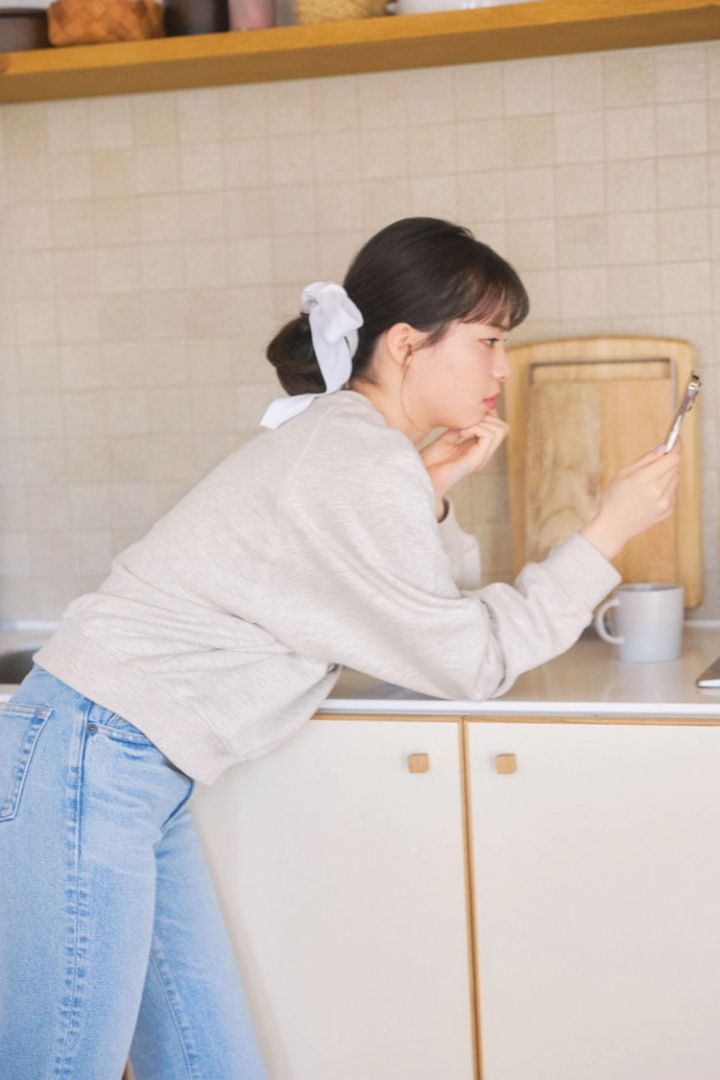 デニム×スエットは万人受けのカジュアルコーデ。ヘアリボンあわせがアクセントに♡