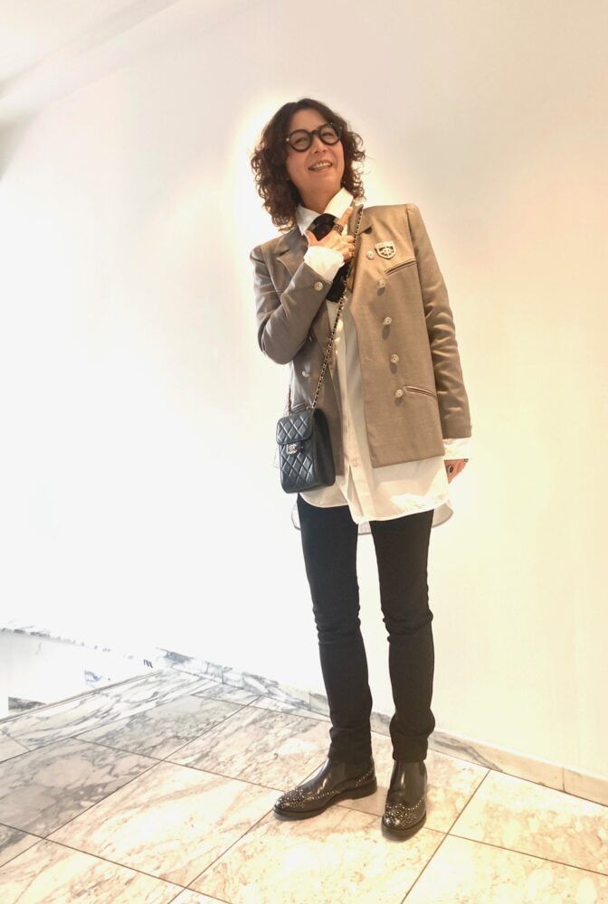 いっしょにパーティに出席したご友人と、「シャネル」の装いをしてこようと決めてきたという、この日のコーデ。ふんわりしたシャツに、細身のパンツと短め丈のジャケットでメリハリをつけスタイルアップする姿は、まさにおしゃれ上級者!