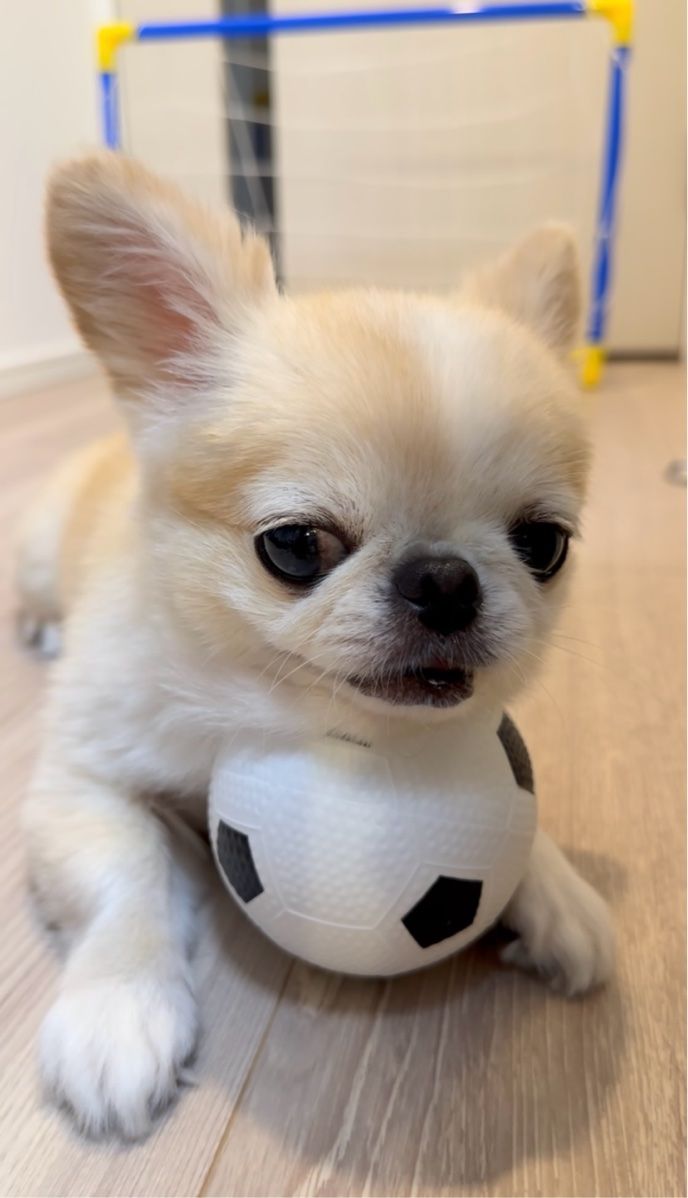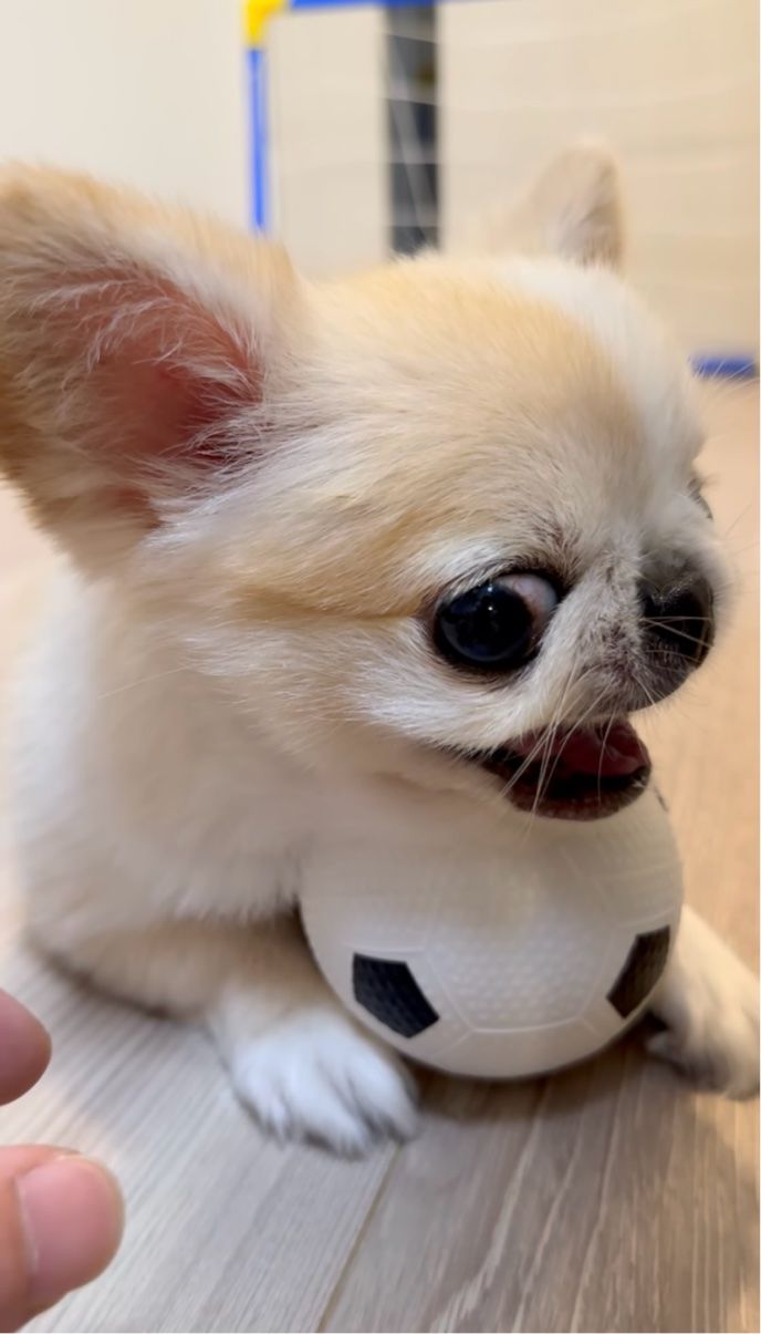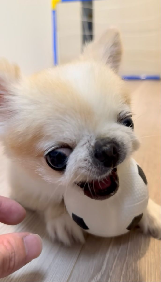サッカーボールを死守するチワワ。 愛らしい外見のこの子が見せた強気な姿勢は、こちらの動画からご覧いただけます。