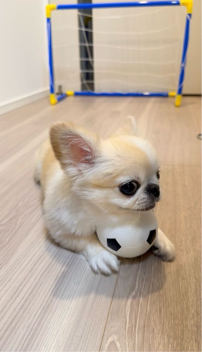 サッカーボールを守るチワワ。 飼い主さんが手をそっと伸ばすと・・・「ボールは渡さない!」とばかりに強気にディフェンスしてみせました!!