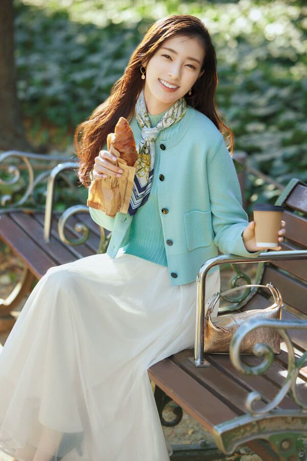 ×ホワイトで清涼感を高めたパステルグリーンは、清楚な甘さがレディ好み♡ スカーフでエレガントさも後押し。