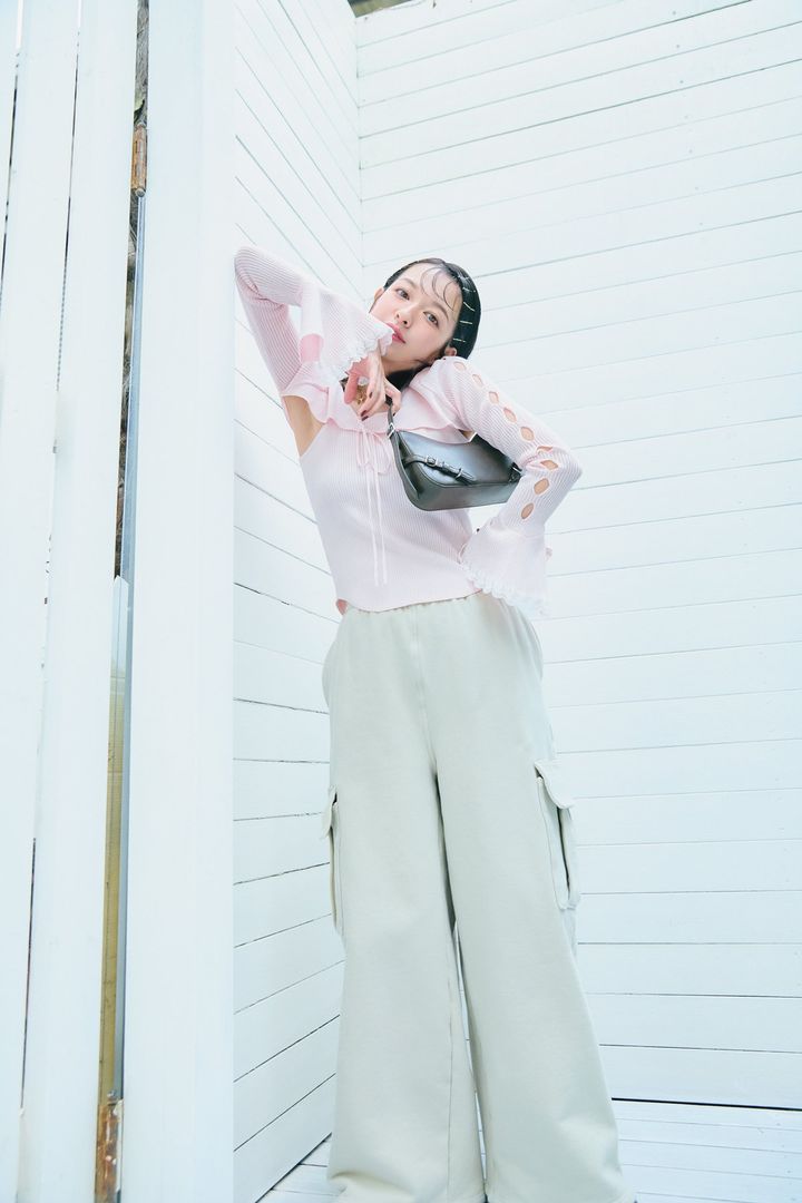 ラブの色=ベビーピンクを今年らしくラフに着るには、 大流行のスウェット地の太めカーゴと合わせるのが大正解!