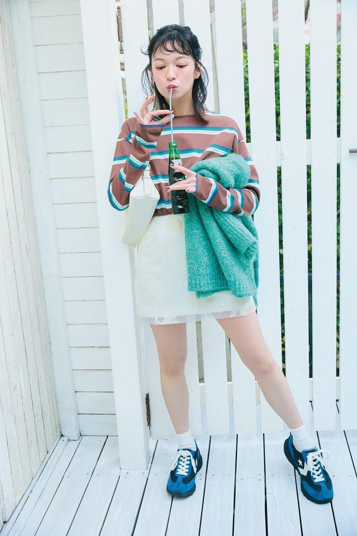 茶色のMIXボーダートップスのスポーティアイテムと、ギャップを効かせて着るのが今年らしいバランス。足元は、どこか懐かしのローテク・コンバース(スターファイヤーSC JUPPER)。