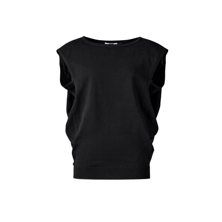 さらっとした肌触りのコットンブレンド素材で真夏も快適そう。ノースリーブとは言いつつも、肩先にかかるくらいの袖があることで、気になる二の腕をほんのりカバーしてくれます。ゆったりとしたコクーンシルエットに加え、後ろの裾はヒップに沿ったラウンドデザインになっていたりと、着痩せ要素が満載です。