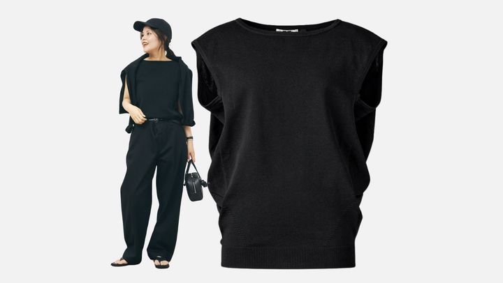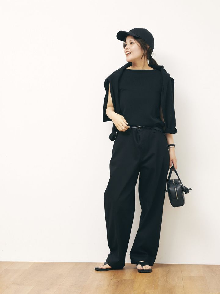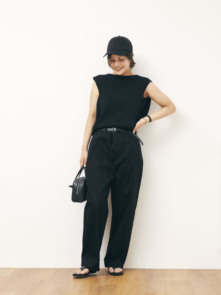 コクーンセーターノースリーブ[09 BLACK]¥2,990ワイドフィットチノ¥3,990ナローロングレザーベルト¥2,990 (すべてユニクロユー/ユニクロ)キャップ¥1,990(ユニクロ)その他本人私物