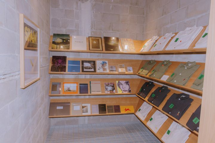 不定期でテーマが替わるブックコーナー。ブルース・ウェーバーの写真集などの書籍と衣類が並ぶ。