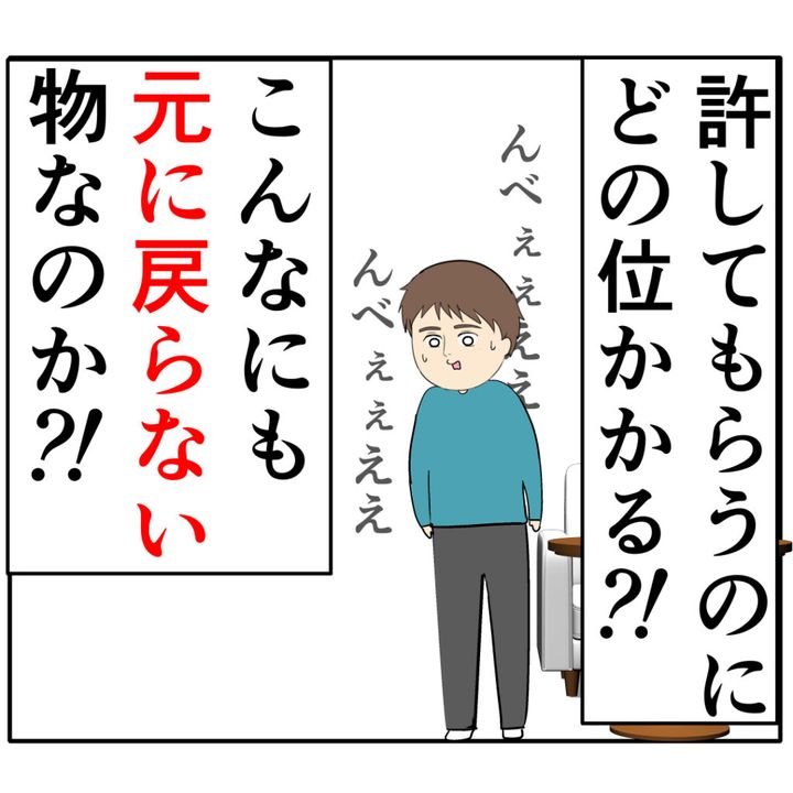 部屋にひとり残されたろみ緒さんは「許してもらうのにどの位かかる?!こんなにも元に戻らない物なのか?!」と今さらながら自分のしでかしたことの重大さを感じていました。
