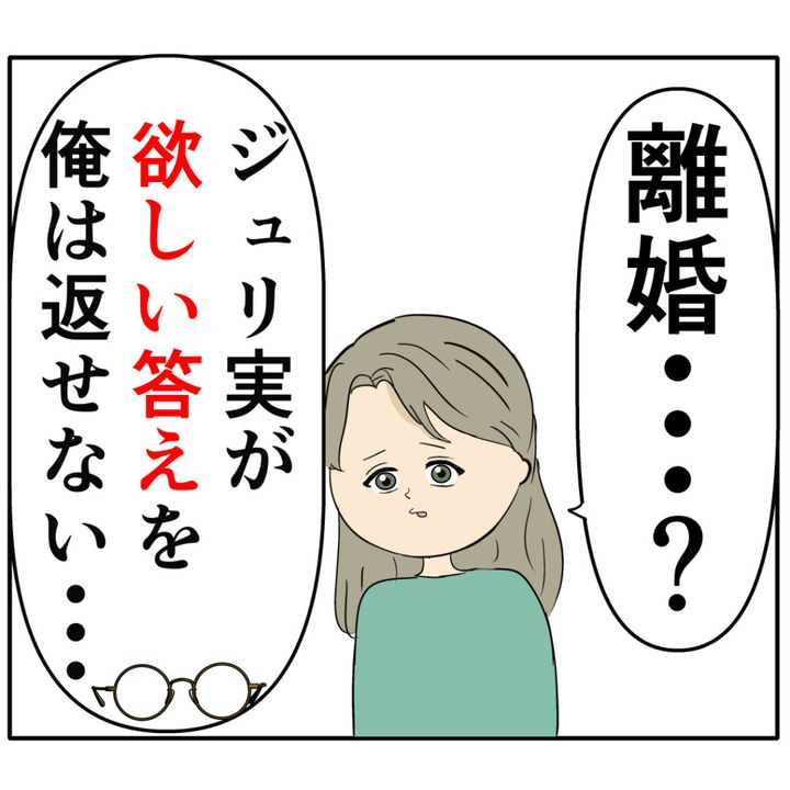 「離婚も選択肢に入れようか」とめが根さんから提案されたジュリ実さんは、「離婚・・?」と戸惑いの表情を浮かべます。めが根さんは「ジュリ実が欲しい答えを俺は返せない・・」と残念そうに言い、