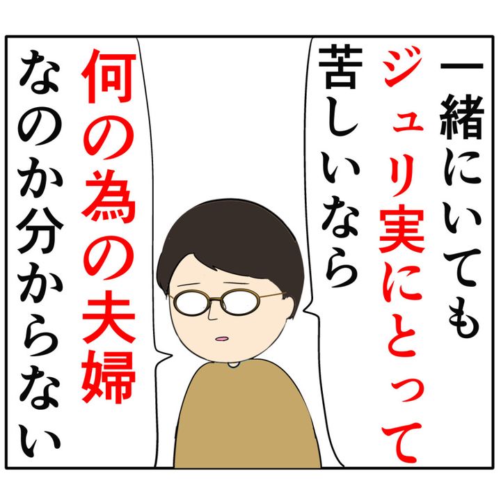 「一緒にいてもジュリ実にとって苦しいなら何のための夫婦なのか分からない」と、夫婦でいることでジュリ実さんを苦しめている現状を辛く感じていました。