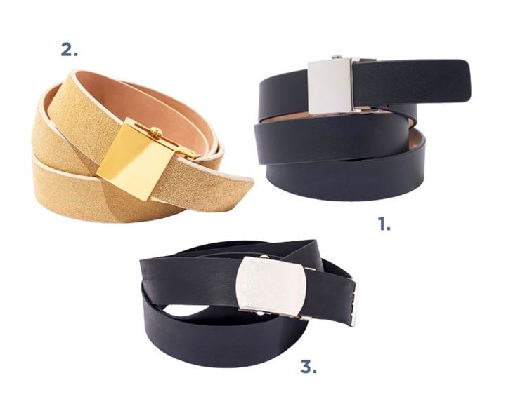 1.万能なシルバーバックルの黒レザーベルトはマスト。2.ベージュスウェード×ゴールドバックルのフェミニンな組み合わせはアクセ感覚で取り入れて。各¥20,900※参考価格(ともにアトリエ アンボワーズ/アマン)3.鈍く光るシルバーバックルがモダンなムード。¥17,600(マヌエラ×カオス/カオス表参道)