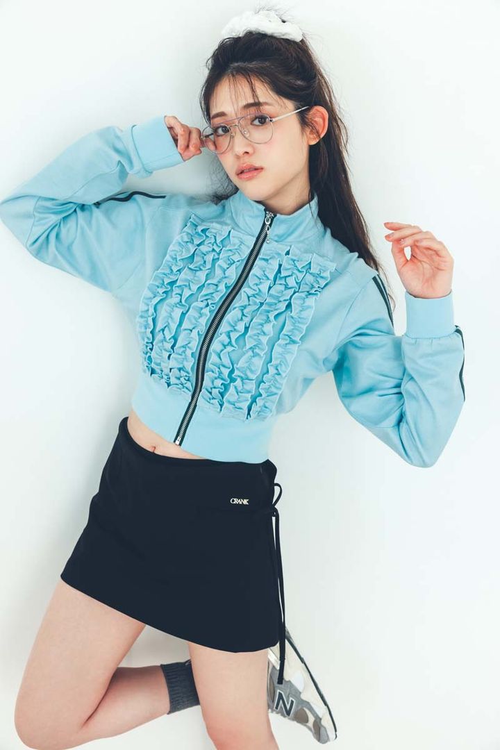 トラックジャケット¥11,000/ジュエティ、スカート¥11, 110/CRANK(HANA SH OWROOM)、シュシュ¥1, 760/ゴールディ、メガネ¥19,800/ダブルラバーズ(スクリーンショット)、ソックス¥2,750/マルディメクルディ(マルディメクルディジャパン)、スニーカー¥24,200/ニューバランス(ニューバランスジャパンお客様相談室)