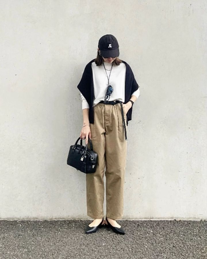 @puu326さんは、ベージュのチノキャロットパンツに、白トップスと黒小物を合わせたモノトーン寄りのナチュラルコーデに。キャップや肩掛けカーディガンが、カジュアルだけど洗練された雰囲気に仕上げてくれます。丸みのあるパンツシルエットがラフすぎず、フラットシューズとの相性も◎リラックス感とこなれ感、どちらも叶う大人のワンマイルスタイルです。