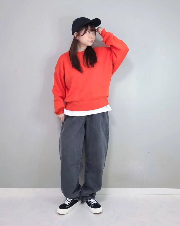 鮮やかなオレンジのスウェットと、グレーのデニムキャロットパンツを合わせたストリートテイストな着こなし。キャップやスニーカーでとことんカジュアルにまとめつつ、パンツの丸みのあるシルエットが今っぽいニュアンスをプラスしてくれます。ルーズなバランス感でもだらしなく見えないのは、キャロットシルエットならでは。オーバーサイズ大好き派におすすめの一枚!