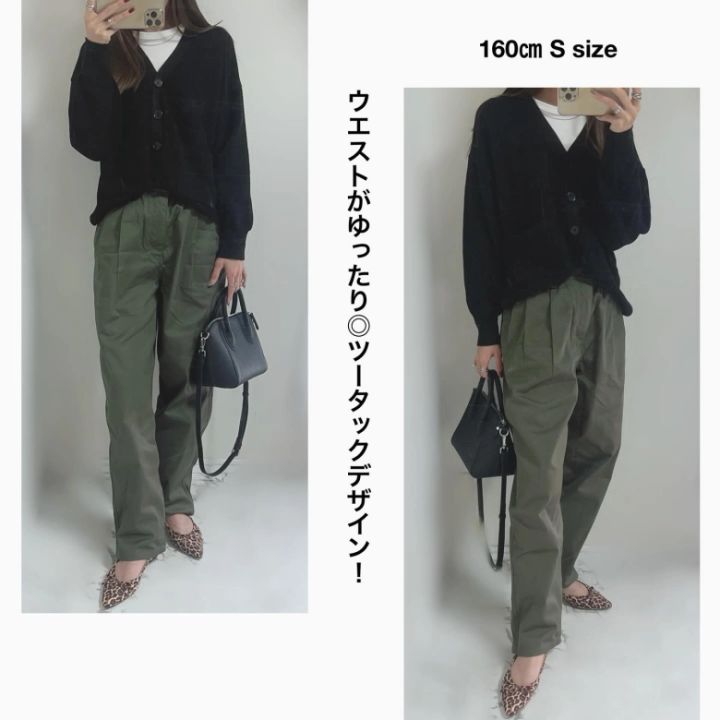 @aiai.miniさんは、オリーブのチノキャロットパンツを着用。ゆったりとしたツータックのチノキャロットパンツに、シンプルな黒カーディガンを合わせたきれいめカジュアルコーデに仕上がっています。足元のレオパード柄パンプスがスパイスになって、甘すぎない大人の余裕を演出。ユニセックスなパンツも、小物使いで女性らしさをプラスすればぐっと垢抜けた印象に。160cmでSサイズ着用、落ち感もちょうどよく脚のラインもきれい!