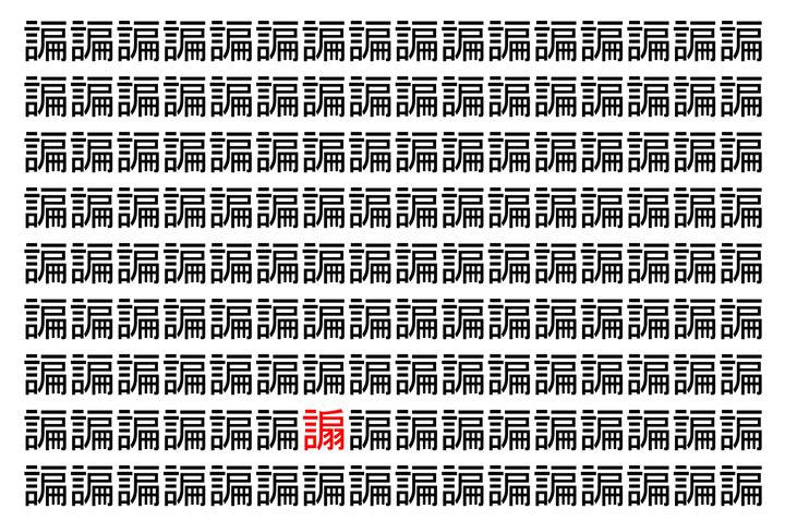 画像に並んだたくさんの「諞」という漢字。 その数144個なのですが・・・、実はその中に1つ違う漢字が紛れ込んでいます!!