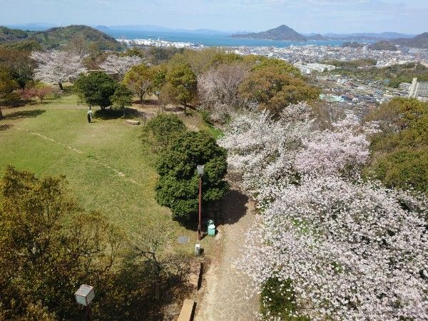 松山の街並み、海のほうまで松山を360度、上から見渡すことができます!!上からの桜の景色と海の向こうまで見渡せる絶景スポットです!