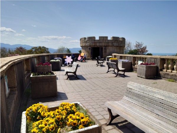 螺旋階段をくるくる駆け上り絶景!お天気も良くて気持ち良い! 塔の一番上にはベンチもたくさんあり景色を眺めながらお弁当食べていらっしゃる方が多いです。上から松山の景色が堪能できます!