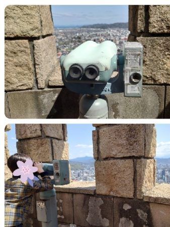 100円を入れて約90秒間、景色を見られる望遠鏡があるので、松山の景色を楽しみました!子どもはすごく楽しかったみたいで「学校の方向はどっちか?」「お城が見える!」など興奮気味でした!