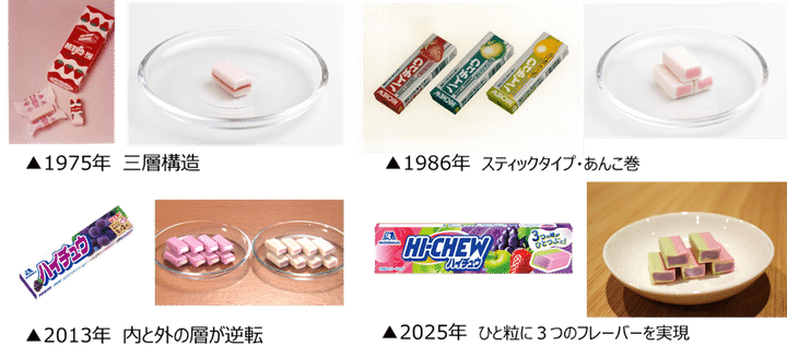その後、スティックタイプになったり、外側と内側の味が変わる二重構造になったりと、時代に合わせて進化してきた「ハイチュウ」。
