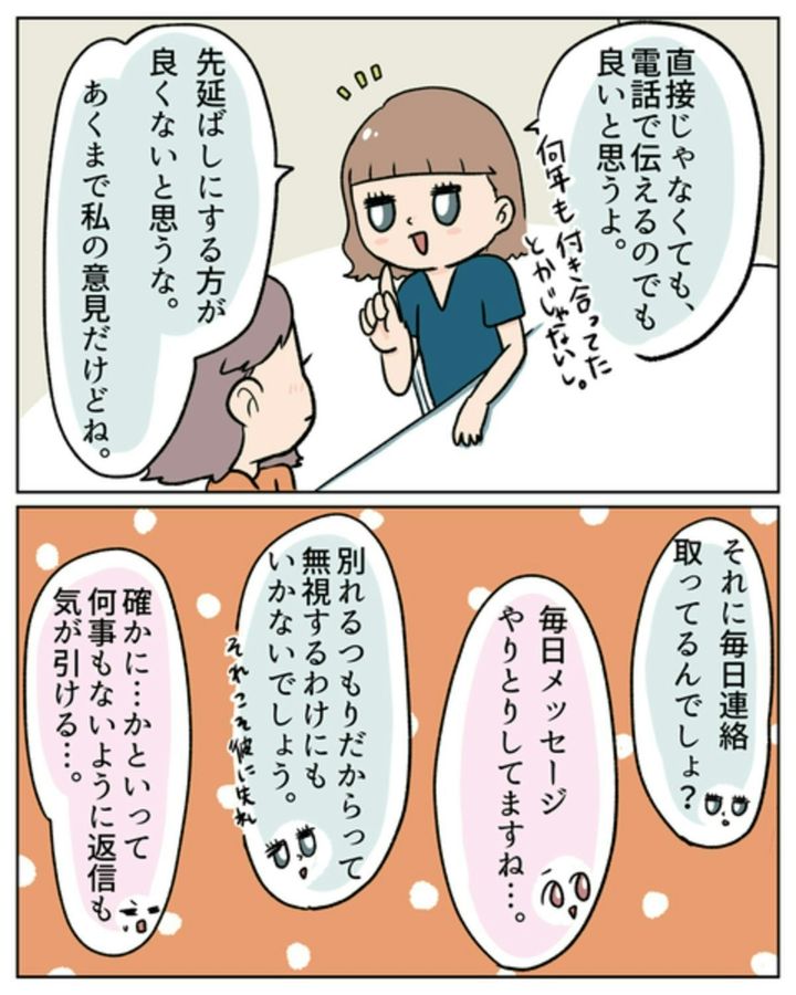「別れたい」と思っていても、切り出すのは難しいものです。今回は、にしこさんの先輩がそばにいてくれて、本当によかったですね。先輩の手助けもあり、無事に別れることができました。